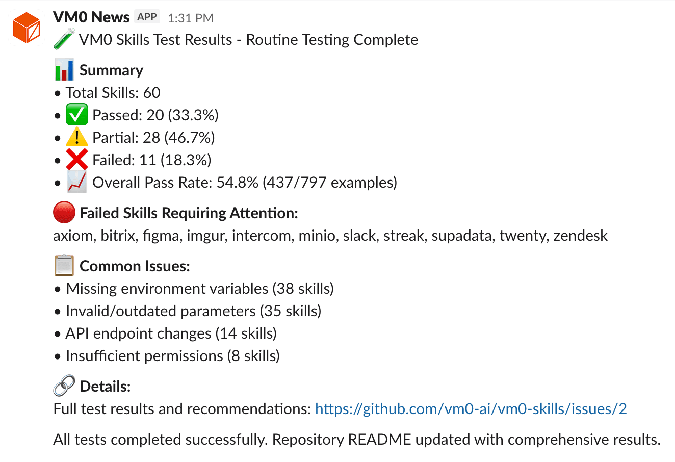 By leveraging VM0's cloud infrastructure and Claude's agent capabilities, you can maintain reliable integrations with external services while minimizing the ongoing maintenance burden. This approach transforms skill testing from a manual, error-prone process into a fully automated quality assurance system.